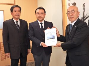長野県ローイング協会と下諏訪町漕艇協会は12月12日、2028年信州やまなみ国民スポーツ大会(国スポ)でローイング会場になる下諏訪ローイングパーク(漕艇場)の環境整備に関する要望書を宮坂徹下諏訪町長に提出しました。