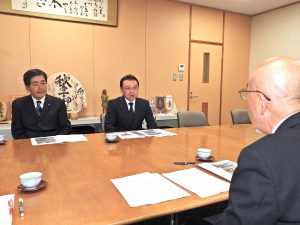 木下芳樹県ローイング協会理事長と小口正志町漕会長が町役場を訪れて会談しました。要望は老朽により解体が決まっている錬成の家とプレハブ艇庫の施設存続と水草対策の2点で、特に競技に影響するほど広範囲に繁茂する水草対策については諏訪湖を管理する県に強く求めるよう要望しました。