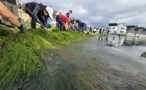 漕艇場では水草、中でもクロモやマツモなどの藻類が10年ほど前から繁茂が顕著になり、年々範囲が拡大してコースを覆うようになりました。今年は8月初旬から9月下旬にかけて競技会に支障をきたすほど大繁茂し、除去に毎朝汗を流した協会役員は「昨年の10倍ほどの密生で水草のじゅうたんが湖面を覆っている」と嘆いたほどです。盆過ぎの大会はコースを縮小したり一部のレースを中止、県高校新人大会は諏訪湖を断念して石川県での開催でした。